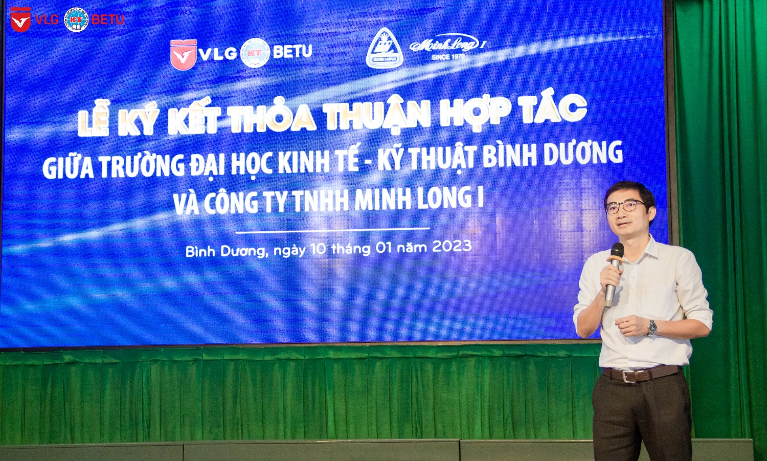 Ngày 10/01/2023, Trường Đại học Kinh tế - Kỹ thuật Bình Dương (BETU) và Công ty TNHH Minh Long I đã tổ chức lễ ký kết biên bản ghi nhớ và tọa đàm “Định hướng tìm việc 4.0 cho sinh viên”. Chương trình có sự tham dự của PGS.TS. Nguyễn Quốc Ý - Phó Hiệu trưởng BETU; Ông Nguyễn Đình Vũ – Giám đốc khối Quản trị nguồn nhân lực Công ty Minh Long I; Ông Nguyễn Ngọc Sơn – Trưởng Phòng Thu hút nhân tài & Thương hiệu tuyển dụng Công ty Minh Long I cùng đại diện của công ty, giảng viên, nhân viên và sinh viên BETU.